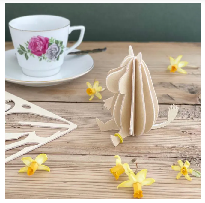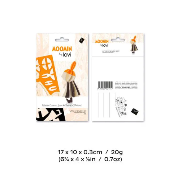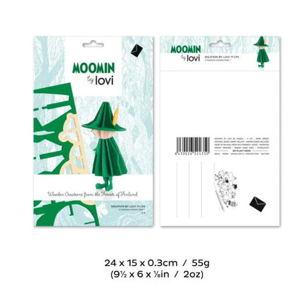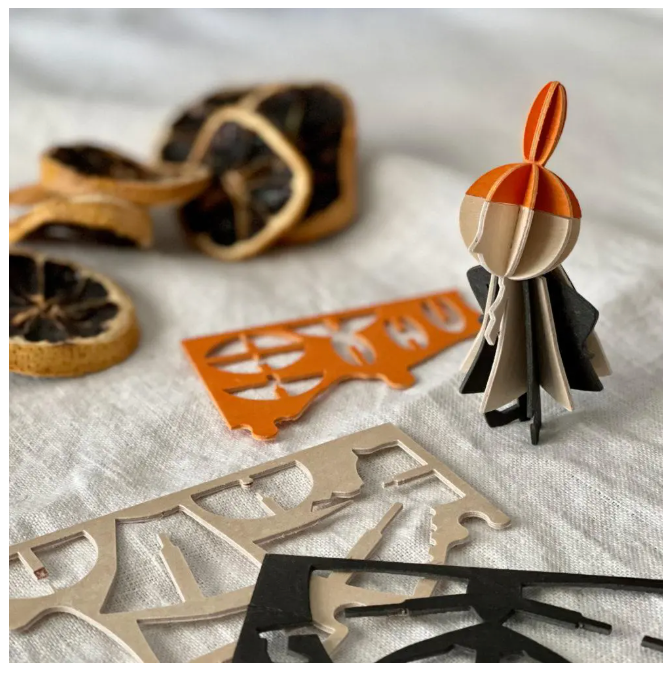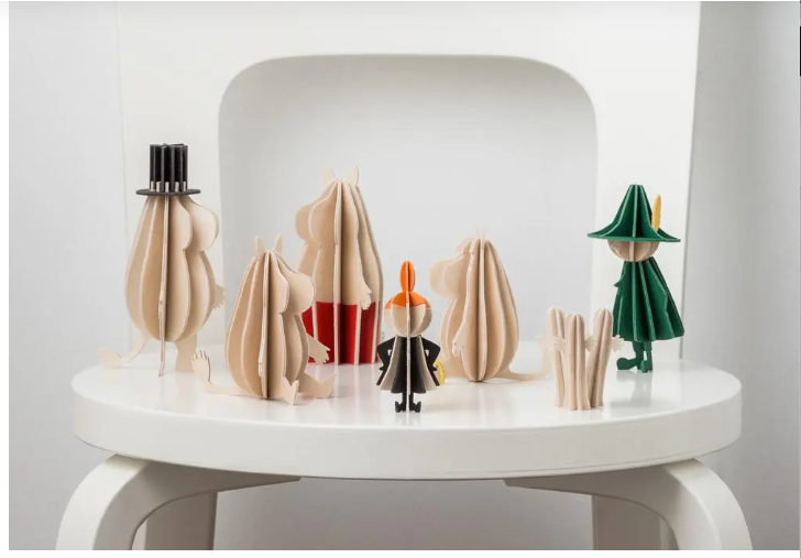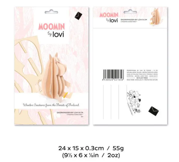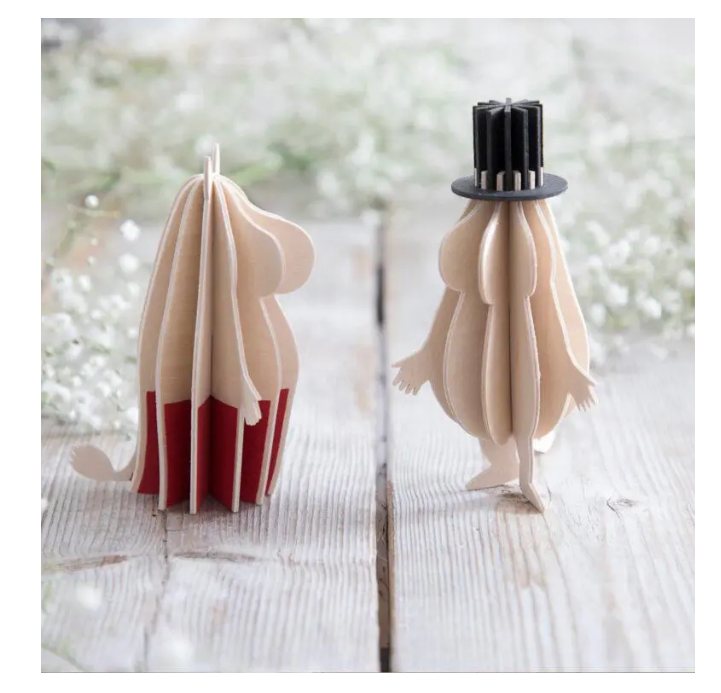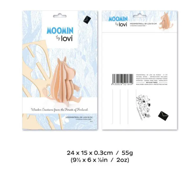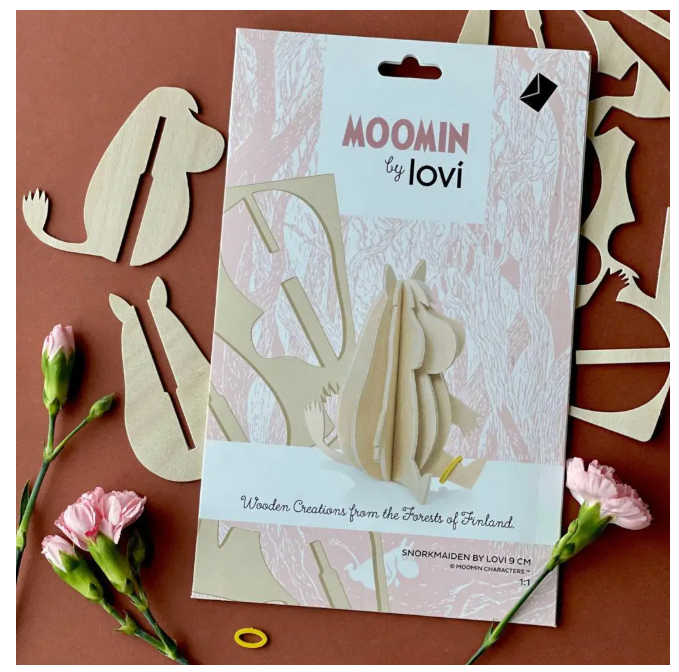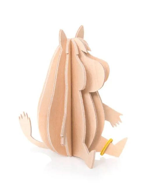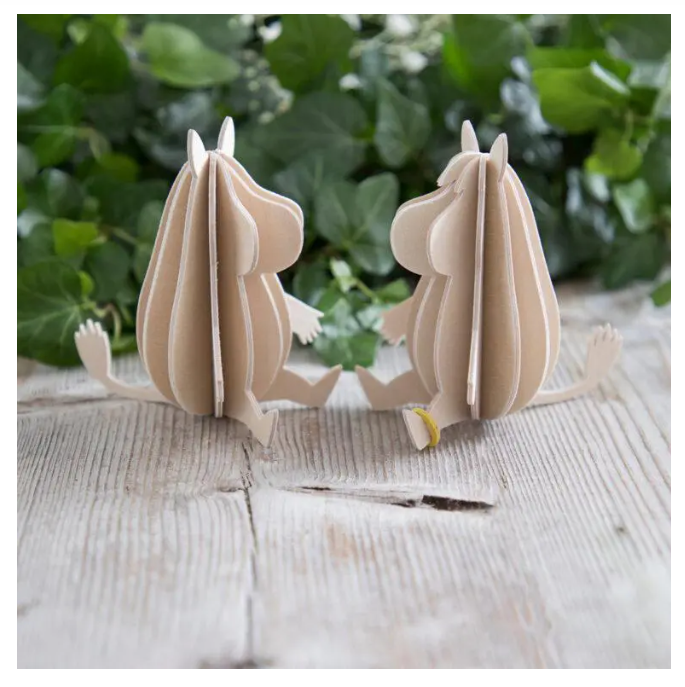 Each Moomin figure is crafted from high-quality Finnish birch plywood in our own factory in Oulu. They come flat-packed in beautifully designed cardboard packages, ready for you to assemble. Illustrated instructions are included to guide you step by step.